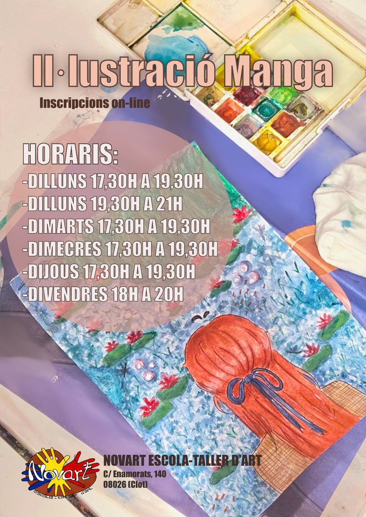En les nostres classes, aprendrem els secrets del manga i l'il·lustració, com dibuixar la roba, la perspectiva, els coneixements bàsics de mans, cares i cossos... a més a més, utilitzarem aquarel·les, acrílics, tintes i plumilles, per a poder expressar-nos de la manera que més ens agradi.